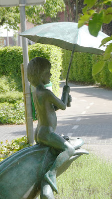 On l’a déjà souvent vu : quand on est un enfant-statue, on peut utiliser plein, plein, plein de moyens de transport. Seulement, voilà, il faut bien avouer que certains de ces moyens de locomotion ont quand-même des défauts. Cette petite fille a choisi une grenouille. Et comme on le sait, la grenouille saute dans des eaux, pas toujours très propre. Alors, pour ne pas salir ses vêtements et se faire engueuler par ses parents, la petite fille les a retirés. Et puis, pour protéger ses cheveux, elle a choisi un parapluie. Et vous ? Qu’auriez-vous fait ?